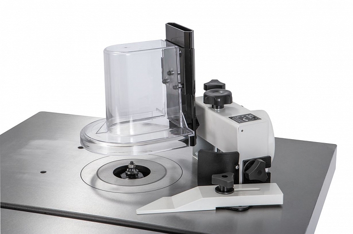 Основные базовые детали станка – тяжелый чугунный стол и фрезерный упор из алюминиевого литья. Теперь этот узел унифицирован с более дорогой моделью, он оснащен алюминиевыми, а не деревянными накладками и имеет прижимы-гребенки, дополняющие вертикальный упор. Увеличен диапазон перемещения упора по столу. Как и прежде, есть отдельная регулировка положения приемного (заднего) башмака.