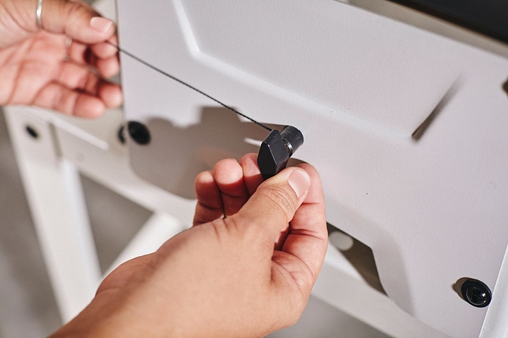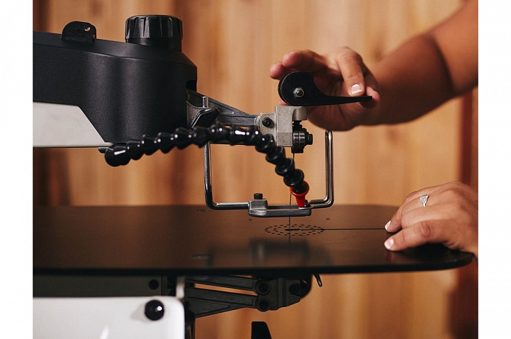 Станок работает с пильными полотнами без штифта. Верхняя часть пилки зажимается эксцентриковым механизмом, совмещенным с натяжителем, нижняя предварительно зажимается в адаптер, а после вставляется в вилку-оправку. В комплекте два таких адаптера, что позволяет иметь в быстром доступе полотна разных типов. Благодаря наличию прорези в рабочем столе существенно упрощается установка на стол заготовок с продетой пилкой.