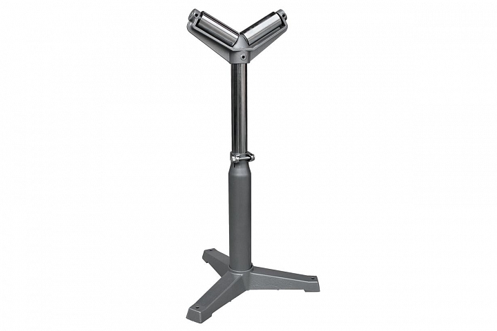 Конструкция выполнена из серого чугуна, имеет регулировку по высоте в диапазоне 600-950 мм. Устойчивое 3-х опорное основание, прочная конструкция обеспечивает оснастке грузоподъемность 200 кг. Масса рольганги составляет 15 кг.